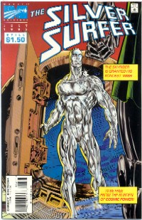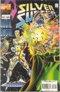 Surfer gives up power. Surfer regains power two issues later. The ultimate point of the story is that because of his experience, the Surfer learns for himself "with great power, come great responsibility." The character would have, I think, better served had he spent more time without the power and the point been a little more profound. This also features one of the silliest cover blurbs, "Doom Boom" indeed. Bottom Line: * out of 5