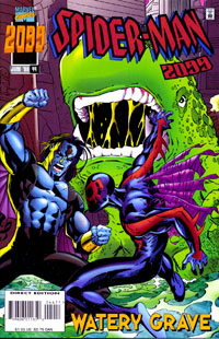 Summary: At sea an undersea base explodes and rises to the surface. A sole survivor is surrounded by sharks and about to be devoured when Spider-Man rescues him by pulling him out of the ocean with a webline and onto a Alchemax transport. The survivor tells Spider-Man that his team was sent to discover what happened when Alchemax lost contact with New Atlantis. He explains that mutates, the genetically engineered undersea slaves, rebelled and took over the colony. Under the leadership of one of their own, Roman, the new Submariner, they plan to fight back anyone who tries to retake the colony. Spider-Man offers the opinion that Alchemax will use force. The survivor then reveals himself to be a human who has sided with the new Atlanteans and jumps out of the transport to report this news to Roman. Roman warns that he will teach the surfacers a lesson they will not forget. Meanwhile, Gabe visits Father Jennifer to tell her that he's been having visions of flood and fire. He thinks he is seeing the end of the world. Elsewhere, Miguel goes Downtown to finally meet with Boru. Their meeting is interrupted when Downtown become flooded by ocean waters and the city is invaded by Giganto. Miguel changes to his Spider-Man garb and goes after Namor who is ordering the creature to attack.
