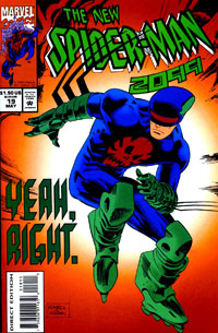 Summary: Lyla's meltdown continues forcing Miguel to don his Spider-Man costume and escape through the bedroom window with Dana over his shoulder. As Spider-Man descends the side of his building he sees that its not just Lyla which has gone haywire, but all the city's computer systems are going wild. At Alchemax, technicians diagnose that a virus is causing all computer systems to do the opposite of what they are programmed to do. They suspect that Discord is responsible. Among the victims of the virus is Hikaru-Sama, head of Stark-Fujikawa, whose car is trapped in the path of another vehicle. Spider-Man arrives in time to save them by ripping the car roof off and pulling them out. Spider-Man then swings away to help others in danger. Later, after changing clothes, Miguel retrieves a reawakened Dana and together they head for Gabe's place. There they find that Gabe is still jacked into cyberspace. Not knowing the state of Gabe's archetype, Miguel decides to jack in to find his brother. In cyberspace, Miguel catches sight of his "sig trail" and follows it to the remains of Gabe's car. Standing above its charred remains is Discord. Discord entreats Miguel to enjoy cyberspace while it lasts.