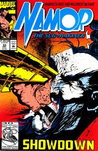 In the offices of Oracle Inc, the sorcerer Master Kahn holds Namor, his allies, and Doom prisoner inside of a glass bottle. With his mutant strength, Namor breaks through the wall of the bottle freeing them all and retuning them to their proper size. Doom attempts to avenge himself on Master Kahn but Namor intercedes because Kahn’s feud is with him. Ultimately Namor kills Kahn by ripping his head off.