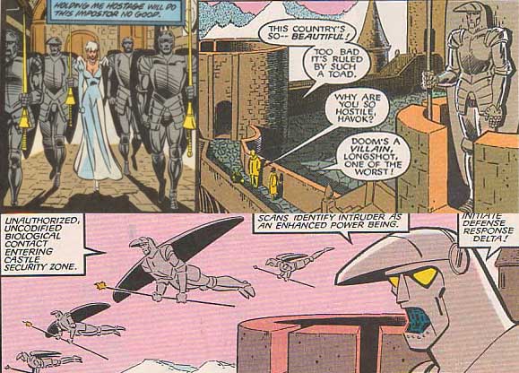 The main duty of this class of Doombot is to keep the Latverian population in check and in Latveria. They serve as Latveria's first line of defense from attacks without and within. They are both army and police force. So effective are they, King Zorba continued to use them as Latveria's police force during his reign. Even during Doom's frequent absences, these Doombots carry out important duties. Among them are to insure the safety of Doom's gypsy kin, the Zefiro, by stationing themselves around their camps. Additionally they safeguard his secrets by placing technology from his lab inside a teleportation matrix. The robots are programmed to use all types of Doom-created weaponry, including Electro-Shock pistols, Insulato-Shields, and many others. This class of Doombot is "humanized" meaning that at times they seem to exhibit real human emotions such as fear of Doom's wrath should they fail in their duty. Although Doom is constantly working on creating more advanced robots, this class has remained a staple of his armory.