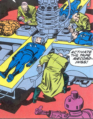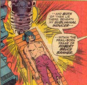Also used while the recipient is asleep, the Inducer has the ability program loyalty and obedience to whom ever it is used on. Doom used this device on Dr. Bruce Banner in order to take command of his skill in gamma technology and his alter ego, the Incredible Hulk. Appearances: Incredible Hulk #144 |