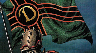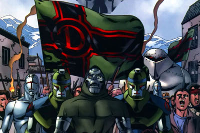 Years later, on the duplicate Earth sometimes called 'Planet Doom' another flag was presented. Totally different from what has come before, it can be argued that this flag is not meant to embody Latveria but perhaps Planet Doom. However the flag has been used several times since then, indicating that it may in fact represent the nation of Latveria and all its "territories" and not just Doom's presence on Planet Doom. This flag has appeared in Doom: The Emperor Returns, Secret War #5, and Captain America #23. A variation of the flag was first seen in Books of Doom #6 and later in Penance - Relentless #4
