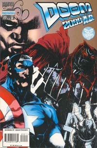 Summary: At the former location of the White House, Captain Wark of SHIELD surveys the destruction and wonders when someone will explain to her what is going on. She then receives orders that all members of Doom's government are to be killed on sight. Nkrumah is found in the rubble and he claims diplomatic immunity. Elsewhere, Indigo Eshun is on the run. She jacks into one of the public dive booths she established only to be killed as soon as she enters cyberspace. In LA, the population is being decimated by gamma radiation. Sharp Blue attempts to contact Doom to inform him of the situation when suddenly they are attacked by Wave Spiders. Blue quickly learns of the coup and the warrant for her death. She and the other mercs escape the wave spiders and head for Mexico. Back in Chicago, Herod meets with Captain America and informs him that he is now president. Cap objects because there was no vote or democracy. Herod then strikes Cap with an energy device. Bloodied and wounded, Cap asks what Herod wants. He explains that he wants to bleed America dry and relocate off world then do it again somewhere else. Cap agrees to help so long as it involves killing people. In Washington, SHIELD agents find a single glove from Doom's armor in the rumble that was once the Oval Office.